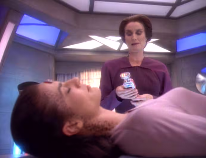 Szantaż Sisko jest skuteczny i Jadzia podejmuje świadomą, pełna ryzyka, decyzję o przywróceniu pamięci o nosicielu mordercy.