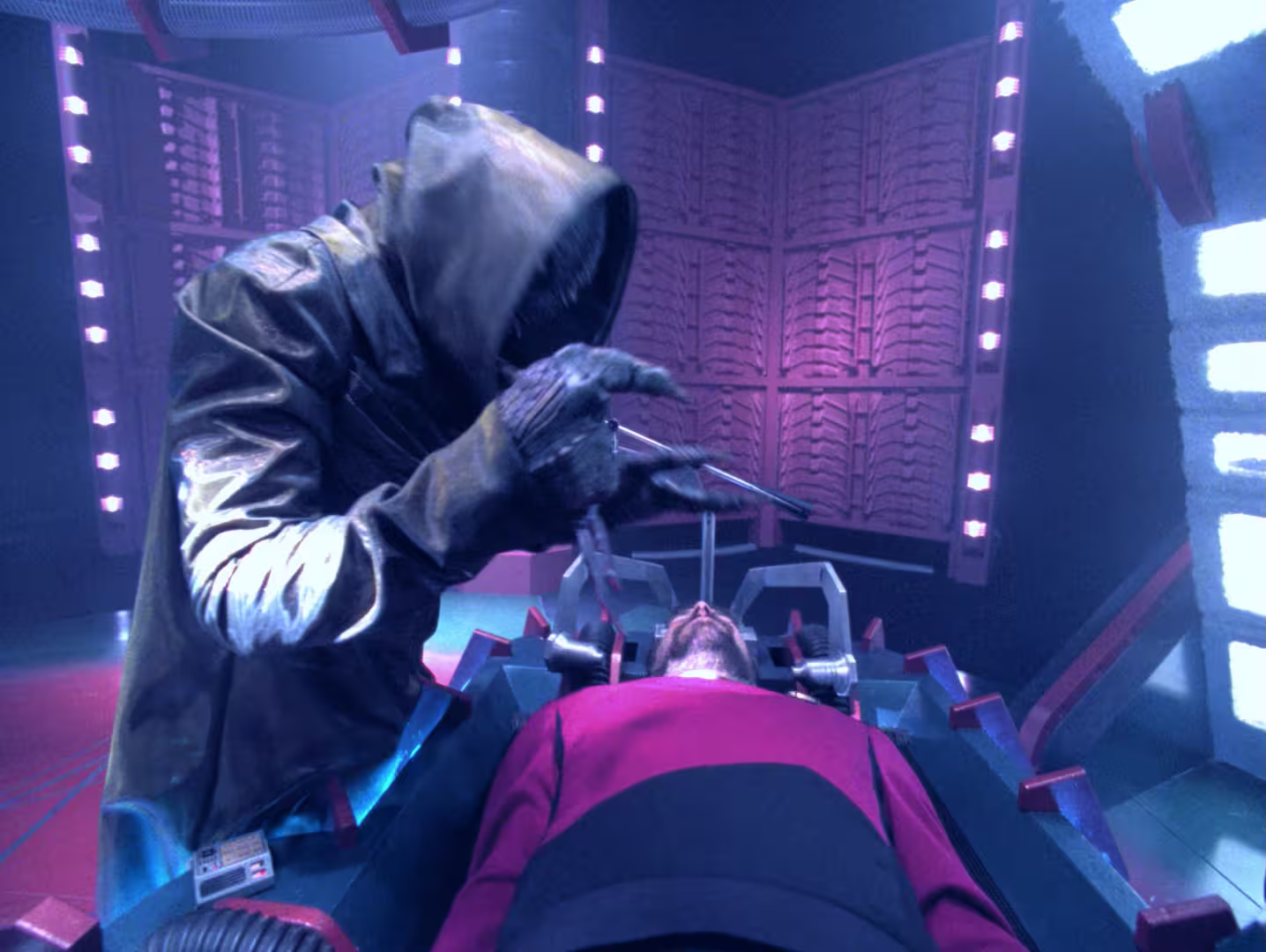 Ciekawa jest scena, gdy decydują się na grupową terapię, a potem próbują odtworzyć swe szczątkowe wspomnienia na holodeku – wyłaniający się powoli obraz nie napawa optymizmem... Dodatkowo Riker dowiaduje się, że mu amputowano i przyszyto rękę, aż w końcu pojawia się załogant, który spotkania z obcymi nie przeżył... Brr, aż ciary chodzą po plecach... Za ten specyficzny klimacik należą się plusy.