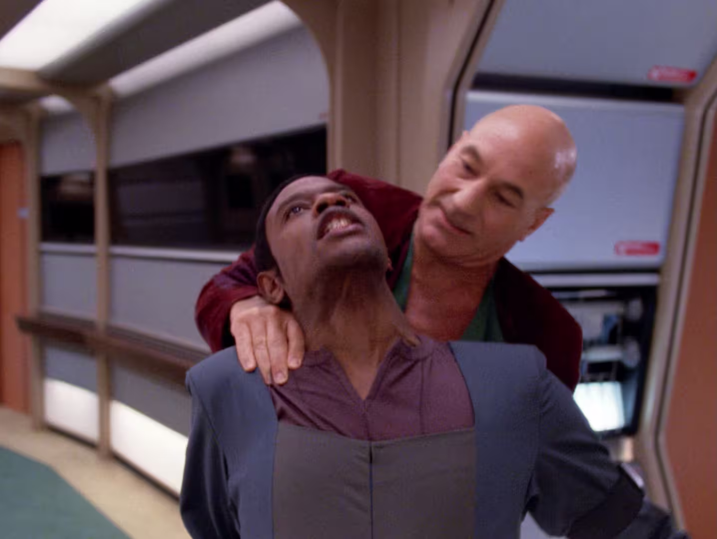 Przywódczyni przestępców zachowywała się też dość dziwnie – skoro niby taka bezwzględna, że bez słowa zabiła swojego kolegę, to po co ciągała za sobą Picarda przez pół okrętu zamiast też go unicestwić, jeśli sama stwierdziła, że branie zakładników jej nie interesuje. Czy tylko po to, żeby jej otwierał drzwi po drodze? Sama by pewnie mogła to zrobić, zabierając mu to małe urządzono – nie widać było, żeby wymagało to jakiegoś szyfru. A tak – zemściło się to na niej... No ale przecież wiemy, o co chodziło – Picard musiał przeżyć, aby być w następnych odcinkach.