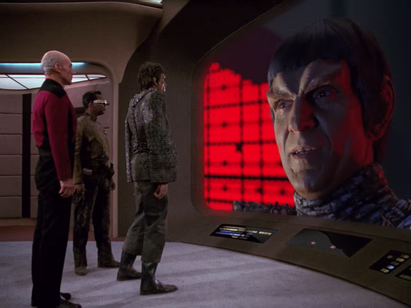 Mamy świetny dialog Romulanina z Worfem poprowadzony tak, że w każdej fabule Worf na złość wrogowi uratowałby mu życie. Ale nie - nasz Klingon nie zmienia zdania. Na nic też pogadanka z panią doktor w kolejnej fryzurze. Wreszcie fabularna armata. Picard robi wykład życia o stawce i możliwości wydania Worfowi rozkazu i dosłownie! go błaga i sam się upokarza przed nim. A Worf odmawia. Romek umiera.