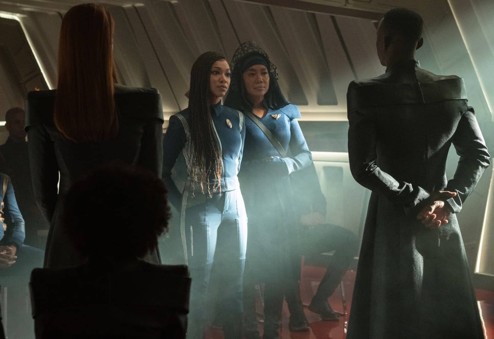 Dalej nie jest gorzej – owszem, mamy dziurę logiczną, bo utajniona M.B. jest nagle znana rodakom przybranego brata i ma +/- status księżniczki, a i historia Gabrielle przedstawiona zostaje zbyt ogólnikowo, by nie generować pytań jakim cudem Romulanie przyjęli ją nagle jak swoją, i to do dość elitarnego zakonu (który nadal nie ma wielkiego sensu, ale dość fajnie został osadzony w nowej rzeczywistości; choć można też nieco sarkać, że przez tyle wieków nic się nie zmienił... z drugiej strony organizacje +/- religijne tak miewają), ale jest to bodaj jedyny moment, w którym wysłanie z misją (zbyt często) centralnej fabularnie (jeszcze) komandor ma wyraźny sens, a i jej – budząca tyle, zwykle niepozytywnych, emocji widzów – historia rodzinna logicznie wpływa na bieg zdarzeń, podobnie jak i przeszłe burnhamowe space jesusowanie. Tak, jedno i drugie udało się na chwilę przekuć w atut.