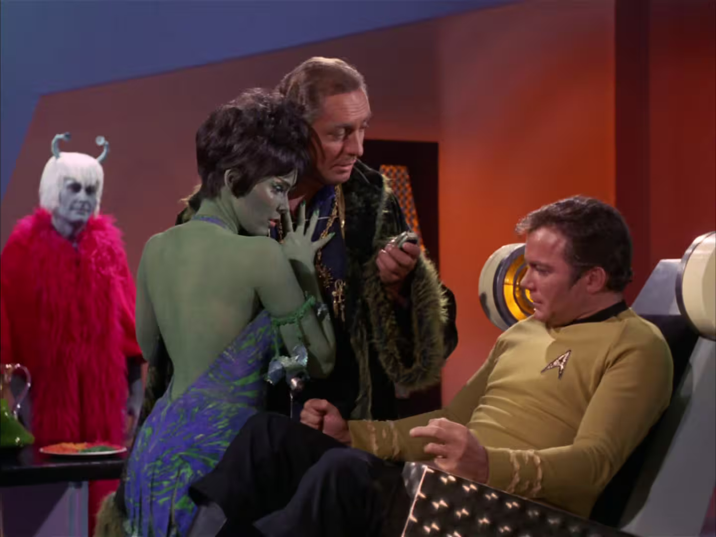 Kolejny odcinek zawiera Andorianina, co prawda w pobocznej roli, ale bardzo lubię ten gatunek. Tym razem uznano, że nie wystarczy ubrać go w czerwoną piżamkę, musi mieć boa. Bardzo szanuję ten wybór estetyczny 😀
