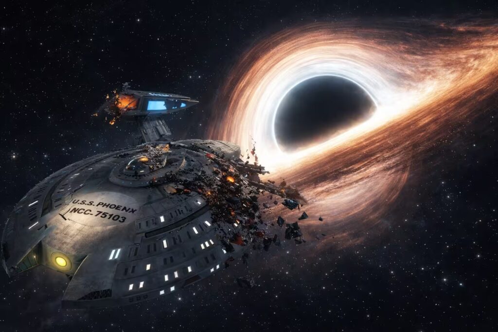 Kontakt uzyskaliśmy w rejonie o skrajnie wysokim ryzyku nawigacyjnym, na obrzeżach dysku akrecyjnego czarnej dziury. Obraz potwierdził USS Phoenix w stanie krytycznym, dryfujący na granicy strefy zagrażającej integralności okrętu. Uszkodzenia były rozległe: brak jednej gondoli, naruszenia poszycia i miejscowe przerwania ciągłości strukturalnej. Wskazania zewnętrzne i to, co później zobaczyliśmy wewnątrz, sugerowały oddziaływanie, którego charakter pozostaje niewyjaśniony. W tamtym momencie priorytetem nie była analiza przyczyn, tylko odzyskanie ludzi i zabezpieczenie jednostki.